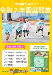 🎈令和7年度 園庭開放のご案内 令和7年度の園庭開放のご案内です。開放時間は9:30~11:30です。ぜひ遊びに来てください!!※雨天の場合は中止となります。HPのお知らせ、Instagram、公式LINEをチェックしてください